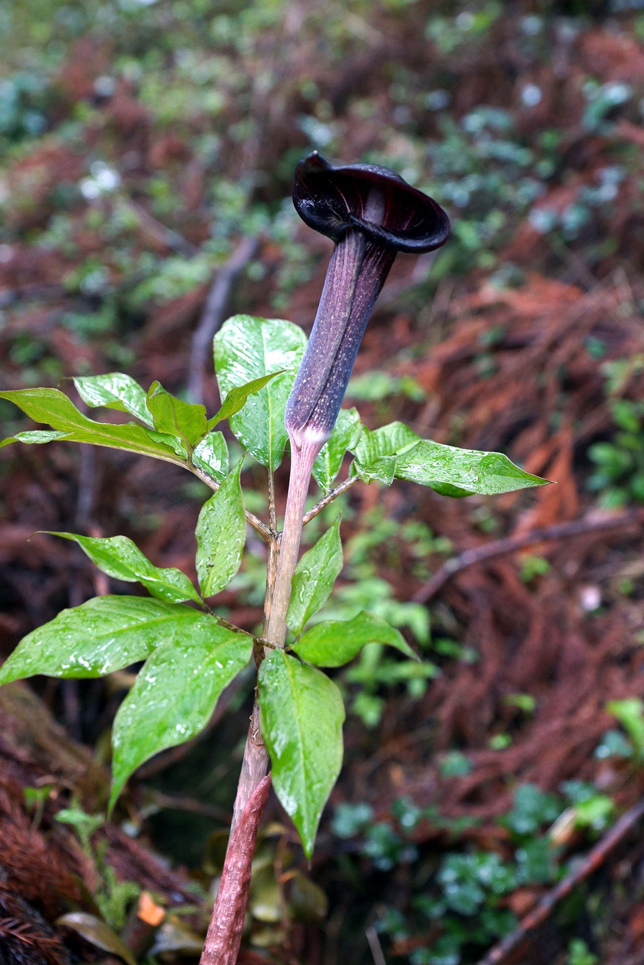 低地から山地の林下、草地などに生える多年草。成長すると高さ50~60cmに達する。葉は普通は2枚、ややまれに1枚つき、下のほうが大きくて7~17枚の小葉に分かれる。小葉は変異性に富み、長い楕円~広い楕円形。雌雄異株で、4~6月、花茎を直立させて開花する。苞(仏炎苞)は緑~濃紫色まであって白い筋が通る。付属体は細い棒状~太いバット状と変異が大きく、先端部の径3~10mm。偽茎は葉柄下部の2つの葉鞘部分が重なってできたもので、紫褐色のまだらな模様がある。この模様がマムシを連想させるところからこの名がある。果実は秋に橙色から赤色に熟し、トウモロコシに似た形状の果実をつける。
