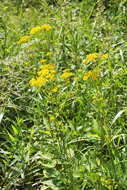 日当たりのよい山の草原に生える多年草。茎は直立して、高さ60~100cm、下部に硬い毛があるが、ほかはほとんど無毛。葉は対生し、羽状に深く裂け、毛は少ない。茎の先や上部の葉の付け根から花の軸を出し、多数の小花が横に平たい大きなかたまりとなってつく。花は黄色で、花冠は5裂し、径3~4㎜、雄しべ4本、雌しべ1個で分裂しない。花期は8~9月。 秋の七草の一つに数えられている。名はその独特の匂いからとか、オトコエシに対して全体的な優しい感じからとの説がある。また、黄色い小花がたくさん集まっているので、これを粟の飯に見立てて、女の人の飯という意味でオミナエシとなったなどとも言う。