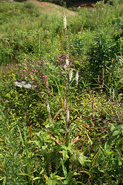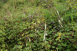 山地の林の中に生える多年草。葉は1回3出複葉、3小葉からなり、小葉は円心形で、長さ7~20cm、幅6~18cm、先は長く細く尖る。小葉は中ほど~少し浅めに5~9裂し、さらに不揃いのぎざぎざがある。高さ40~120cmに茎を伸ばし、花は直立する長い軸の上に穂状につく。花は白色、白いブラシ状の花弁に見えるのは萼片で萼片は4~5枚、花弁は1~8枚、ともに早く散って雄しべが残る。サラシナショウマに似るがオオバショウマは花柄がないのが特徴。花期は8~9月。