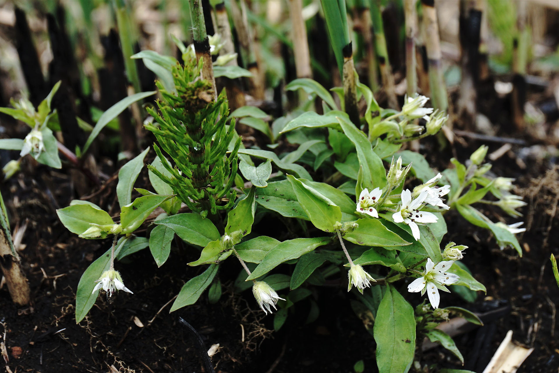 山の草地に見られる多年草。草丈は10〜20cm、茎は直立して、枝を分けない。葉は、下部へら形で上部の葉は広く卵形、最上部の葉は輪生状につく。4〜5月、茎の先端に5枚の白い花弁をもつ花をつける。花弁の先端に切れこみがあるのが特徴。雄しべは10本で赤い葯が美しく、10本の雄しべは5本ずつ熟して変色する。花柄には毛が生える。日本の固有種とされる多年草で、名は、産地の長野県和田峠にちなむ。